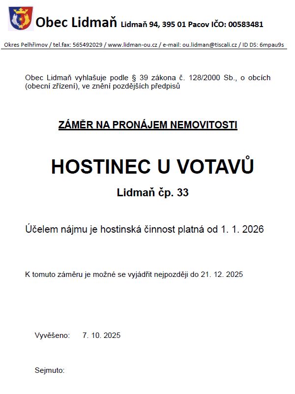 Obec Lidmaň vyhlašuje záměr na pronájem Hostince U Votavů od 1. 1. 2026
